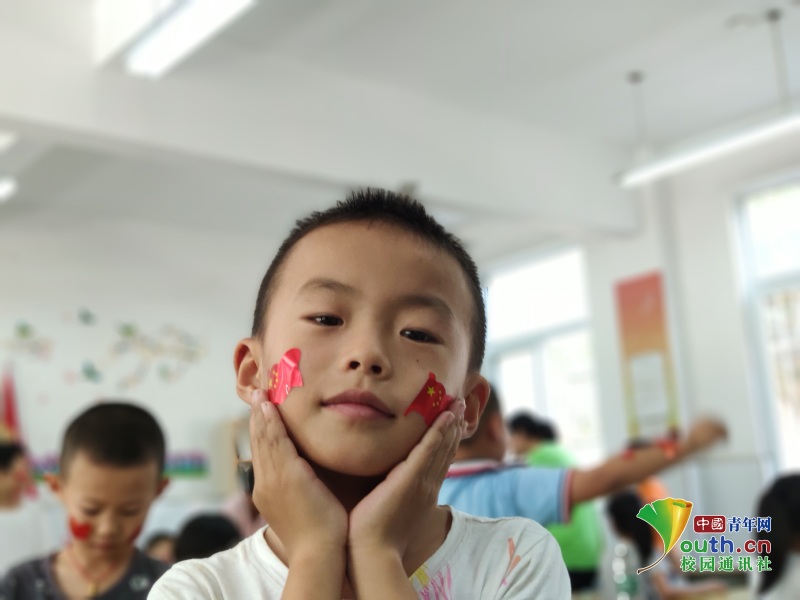 小男孩贴完小国旗摆着姿势请志愿者老师给他拍照片,他说“老师,帮我拍照片,我想给爸爸妈妈看。”