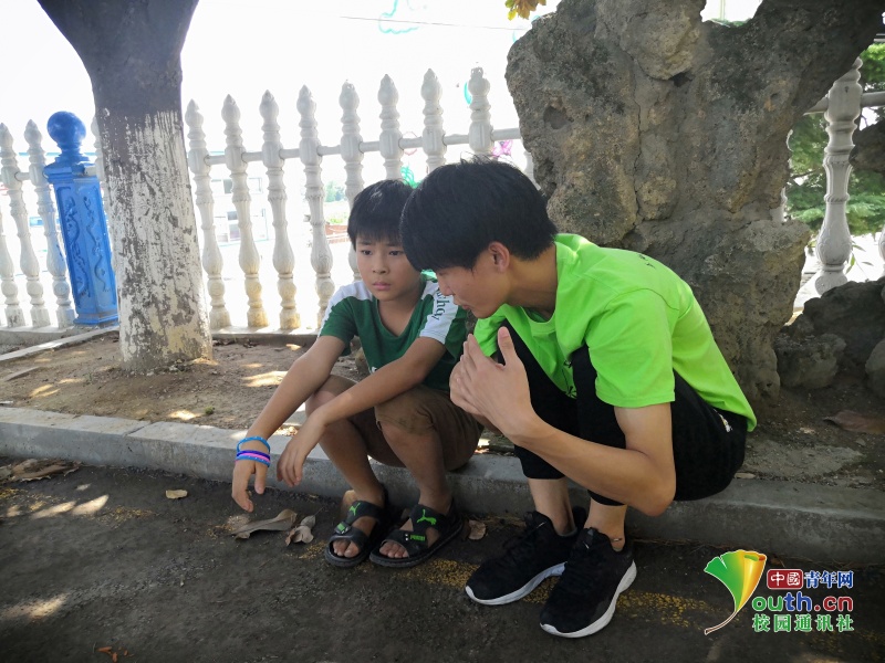 志愿者老师正在和班上最调皮的小男孩谈心,倾听小男孩心里的故事,开导他认真学习积极向上。