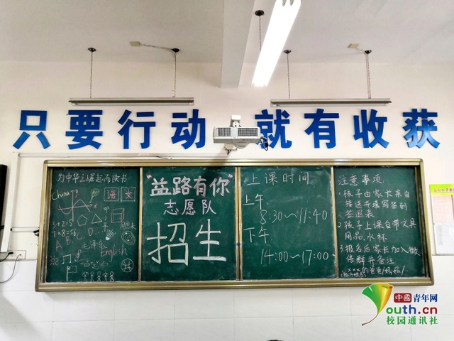 志愿者们为招生布置的教室及板报。中国青年网通讯员 姚祥锦 摄