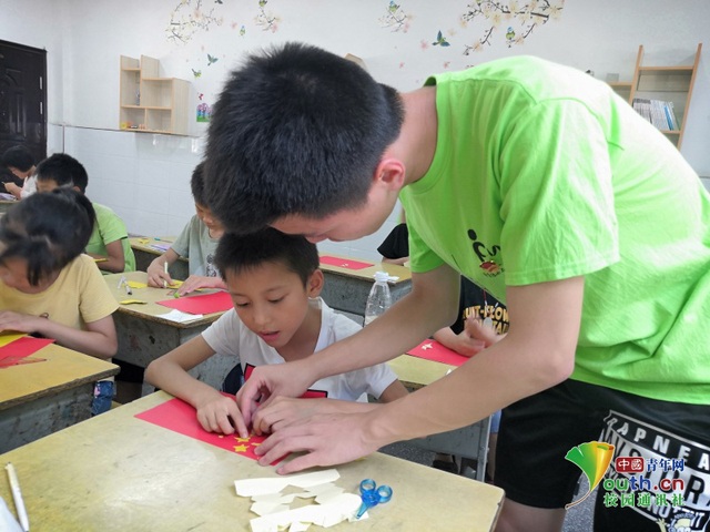 手工课,志愿者协助小朋友一起用卡纸制作五星红旗。中国青年网通讯员 姚祥锦 摄