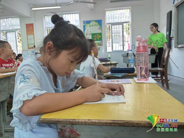 对于没有英语基础的她们来说,英语课格外的有魅力,小女孩正在非常认真努力的在作业本上学写英文字母。中国青年网通讯员 付照湘 摄
