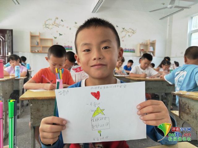 一位小朋友正在展示绘画课的作品,一片爱心,一颗五角星,一腔爱国情。中国青年网通讯员 陈沙沙 摄