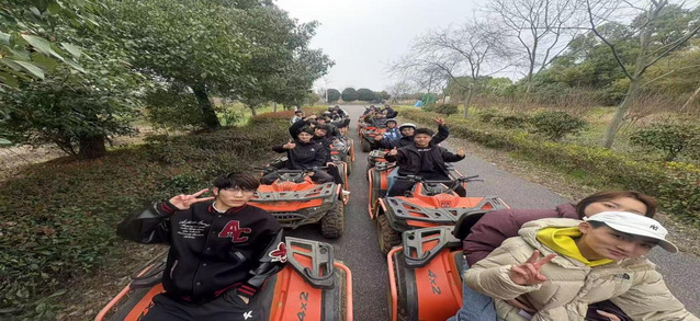 自由活动过后就是刺激的越野ATV项目,大家穿戴好专业护具,跨上全地形车。引擎轰鸣,车轮滚滚,同学们驾驶着ATV在蜿蜒起伏的赛道上飞驰,扬起阵阵尘土,尽情享受风驰电掣的快感,展现出24级休闲体育专业同学们勇于挑战、无畏困难的精神风貌。