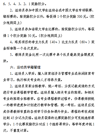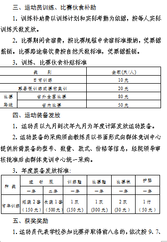 2.获全国大学生单项竞赛四至八名者,省大学生体育竞赛前三名或达到一级运动员等级者,每次训练补贴30元。