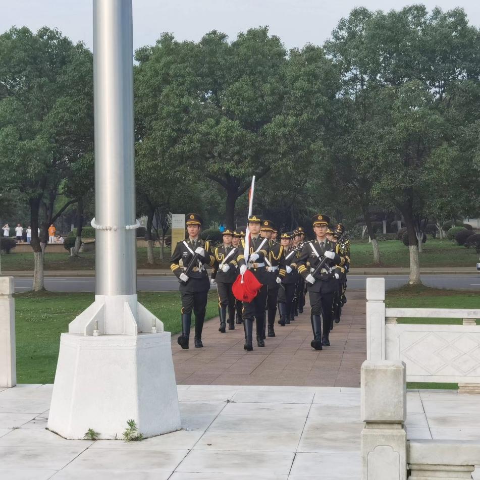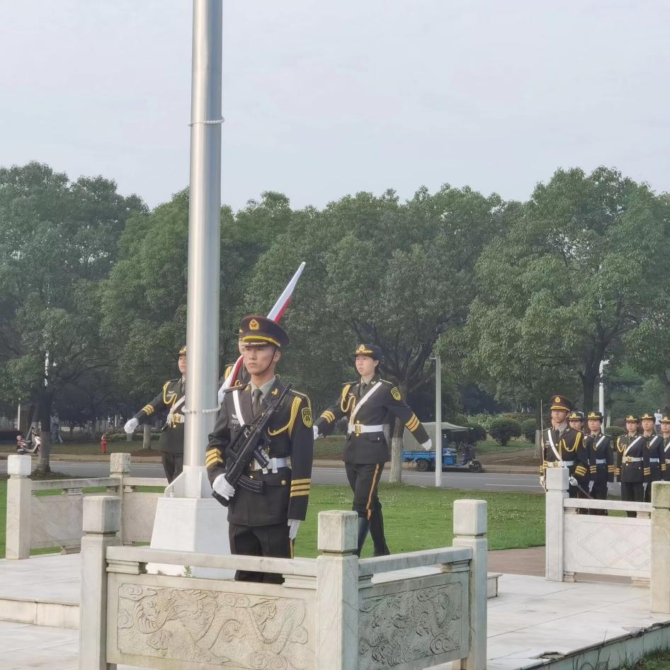 6点50分,师生代表集合整队完毕。6点55分,在昂扬的进行曲中,国旗护卫队步履铿锵地护送五星红旗进场。7点整,在雄壮的国歌声中,五星红旗冉冉升起,全体师生高唱国歌,行注目礼。
